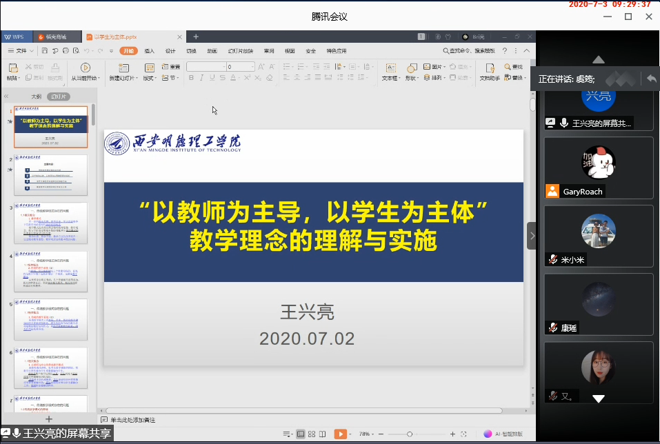 7月3日上午,学院教学研究与教师发展中心举行了2020年新教师线上培训活动第七讲,辅之以腾讯会议软件进行。本次讲座由王兴亮教授主讲。教发中心主任虞筠主持了活动,全院新进青年教师以及新转岗教师29人参加了培训。
