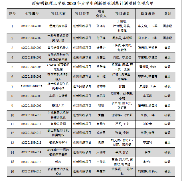 近日,在陕西省教育厅公布的2020年大学生创新创业训练计划项目评选结果中,学院共有16项大学生创新创业训练计划项目立项,其中2项获国家级立项,14项获省级立项,这是我院自参与大学生创新创业训练计划项目申报以来首次获国家级项目立项。