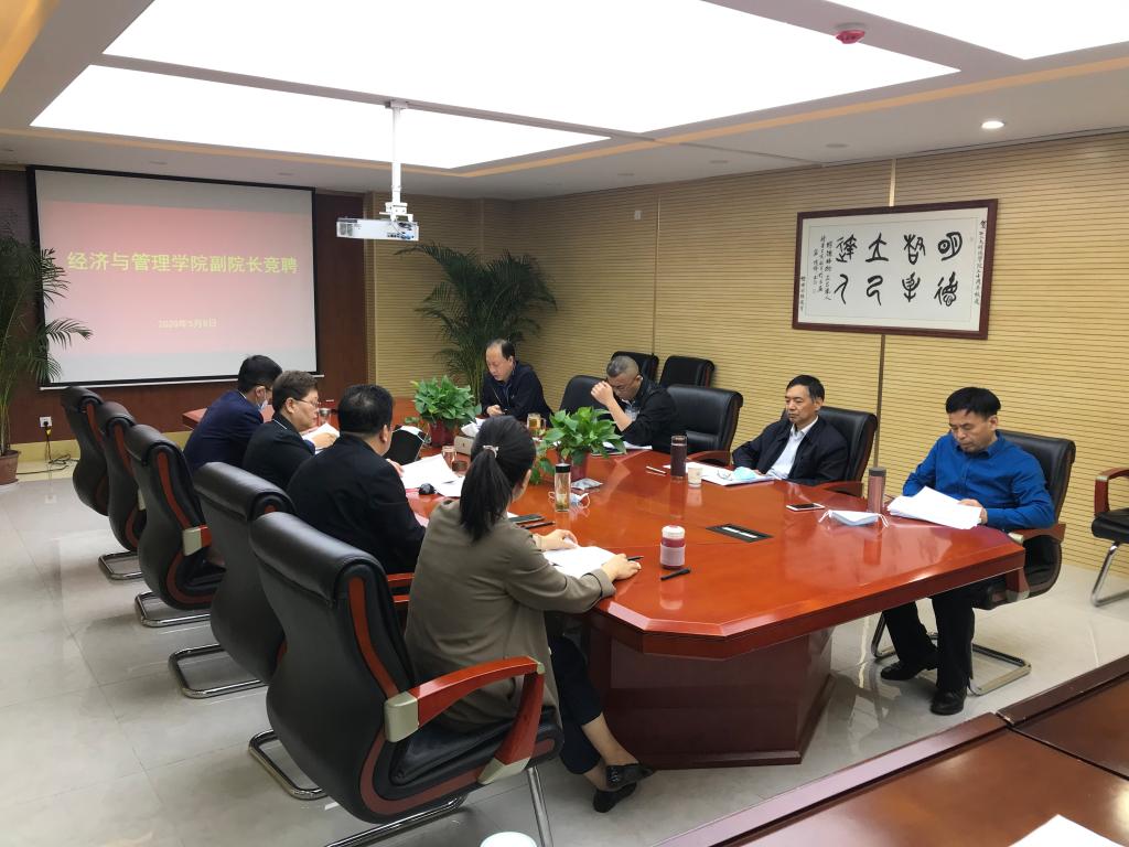 5月8日上午9:30,经济与管理学院副院长竞聘工作在明志楼207会议室举行,参加此次竞聘的领导和评委有:学院执行董事赵天骄,党委书记杨健君,副院长薛康,党委副书记韩承辉,教务科研部部长庾鲜海,经济与管理学院院长郭鹏,学院法律顾问、通识教育学院副院长郑汉印,人力资源部部长韩娅舒。