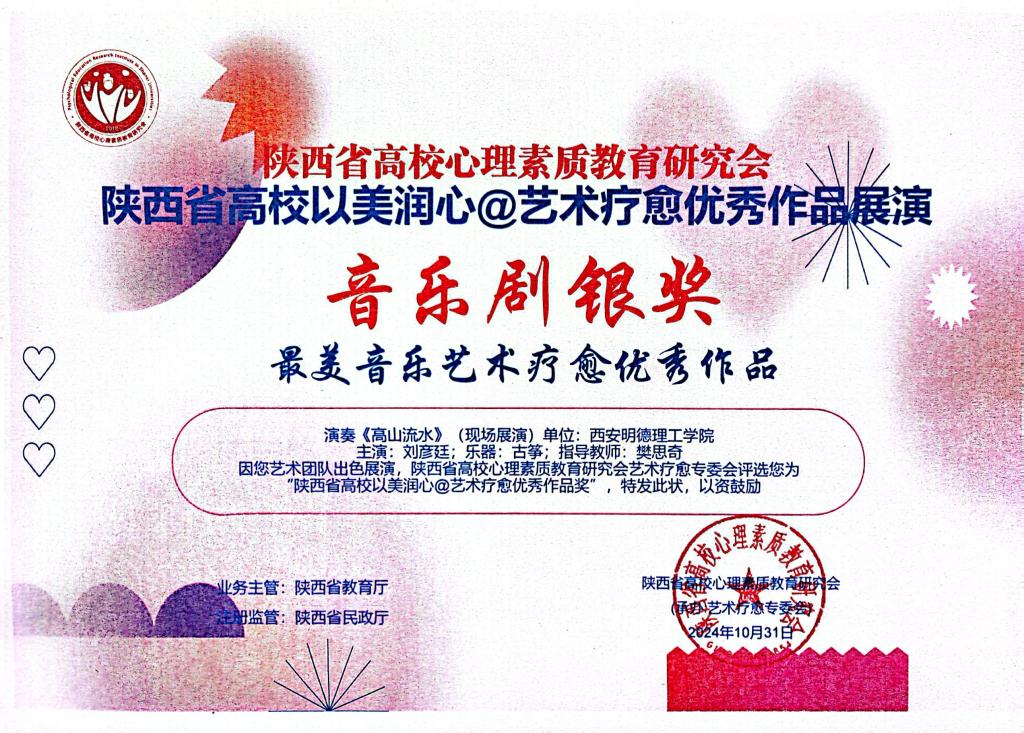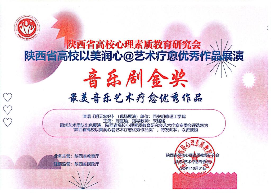 10月 31 日,陕西省高校以美润心艺术疗愈优秀作品展演在陕西艺术职业学院举行。学校报送的舞蹈作品《this is me》、声乐作品《明天你好》、器乐作品《高山流水》分别荣获舞动剧特等奖,音乐剧金奖和银奖等多项荣誉。