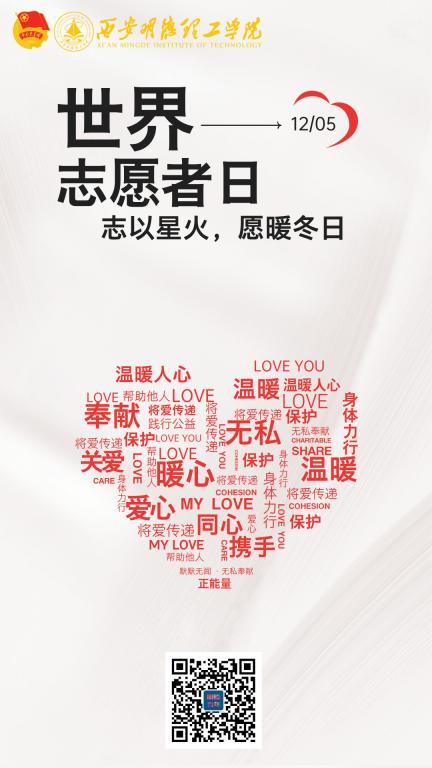 携手志愿,温暖世界。在这个寒风渐起却心怀暖意的季节里,我们迎来了一年一度的“世界志愿者日”。它是全球数百万志愿者共同的节日,是爱与奉献精神的璀璨绽放。志愿者精神既是无私精神与奉献精神在现代社会中的充分代言,又是创造美好生活的源动力。青春因奉献美丽,生命因无私而璀璨。让我们在这个冬天,不以寒冷为惧,而以爱心为裳,携手并肩,用实际行动诠释“奉献、友爱、互助、进步”的志愿精神。世界因你而美好,因善良而温暖。