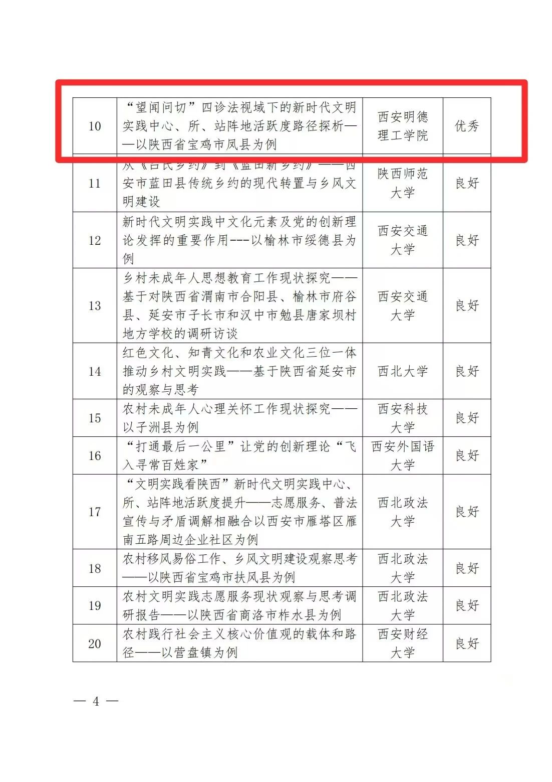 近日,陕西省委精神文明建设办公室公布了2024年度“文明实践看陕西”专项实践活动项目认定结果。经省委宣传部(省委精神文明建设办公室)、团省委组织专家初评、审核、评估等环节,学校“‘望闻问切’四诊法视域下的新时代文明实践中心、所、站阵地活跃度路径探析——以陕西省宝鸡市凤县为例”实践项目被认定为“优秀项目”。