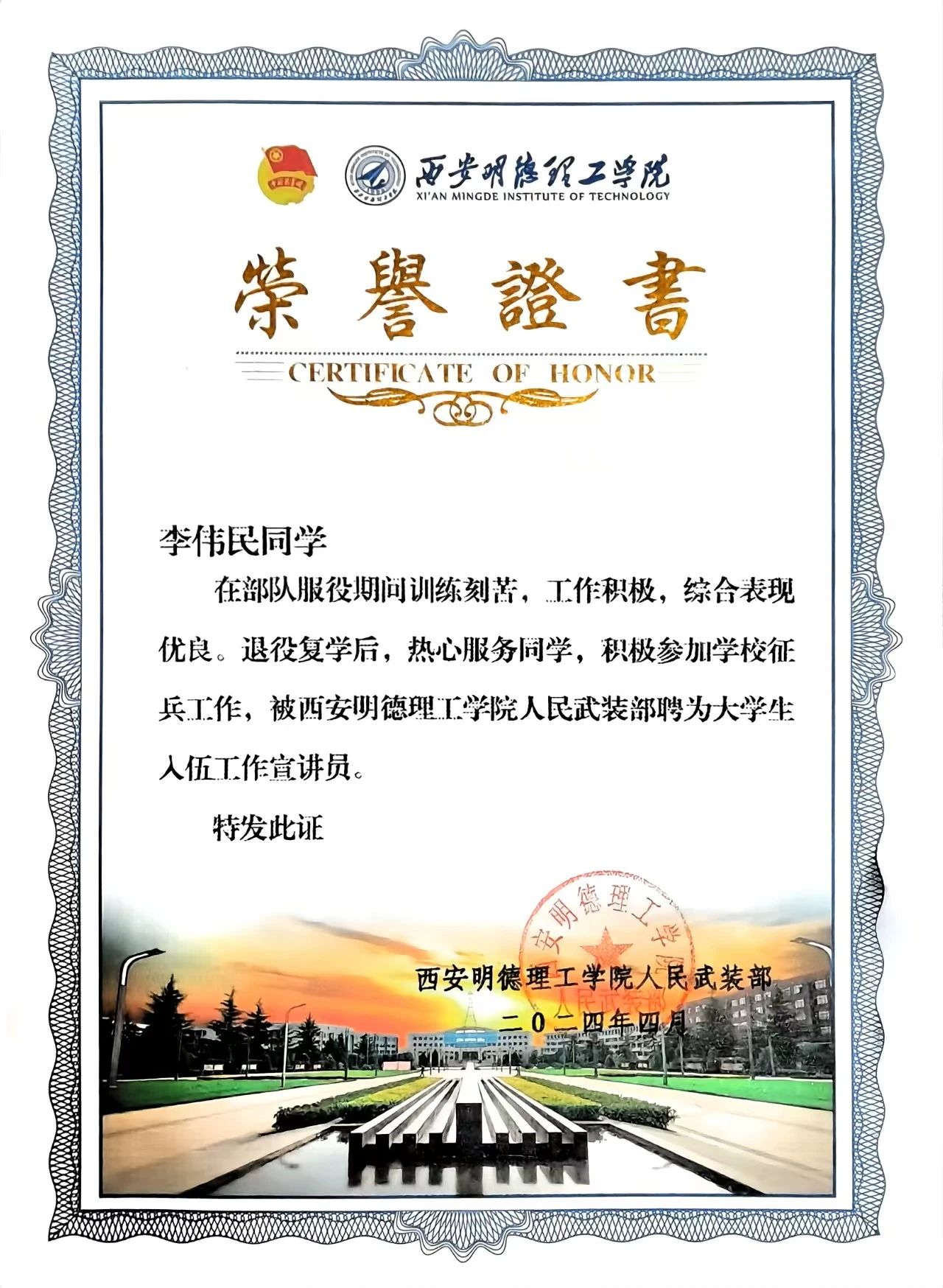 在2023年度服役期间评功评奖中荣获“嘉奖”一次;在2024级新生军训中被评为“优秀教官”;在2024年被校人武部聘请为大学生入伍工作宣讲员;2024年暑期“三下乡“社会实践活动“优秀个人”;智能制造与控制技术学院第9期入党积极分子优秀学员;2024年成功申报2024215760463排料装置专利;2021年获得AutoCAD证书、普通话二级乙等证;荣获2023学年校一等奖学金、国家励志奖学金。