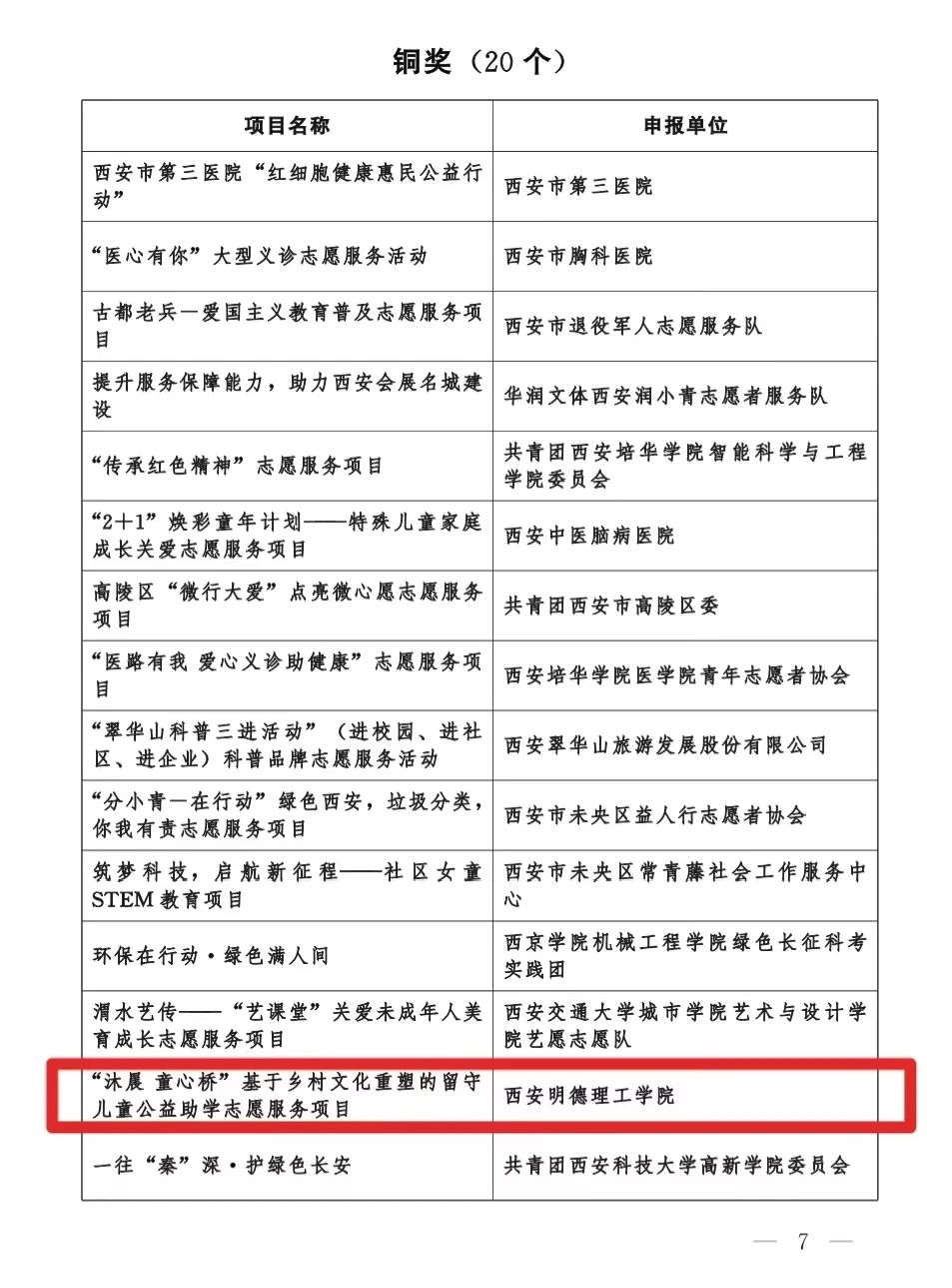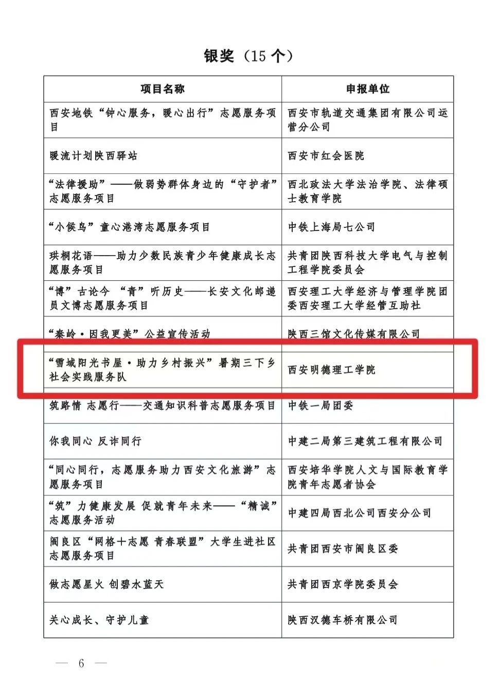 共青团西安市委、中共西安市委社会工作部等公布了西安市第二届青年志愿服务项目大赛项目评选结果的通报》,我校《“雪域阳光书屋·助力乡村振兴”暑期“三下乡”社会实践服务队》获得银奖,《“沐晨 童心桥”基于乡村文化重塑的留守儿童公益助学志愿服务项目》获得铜奖项目。