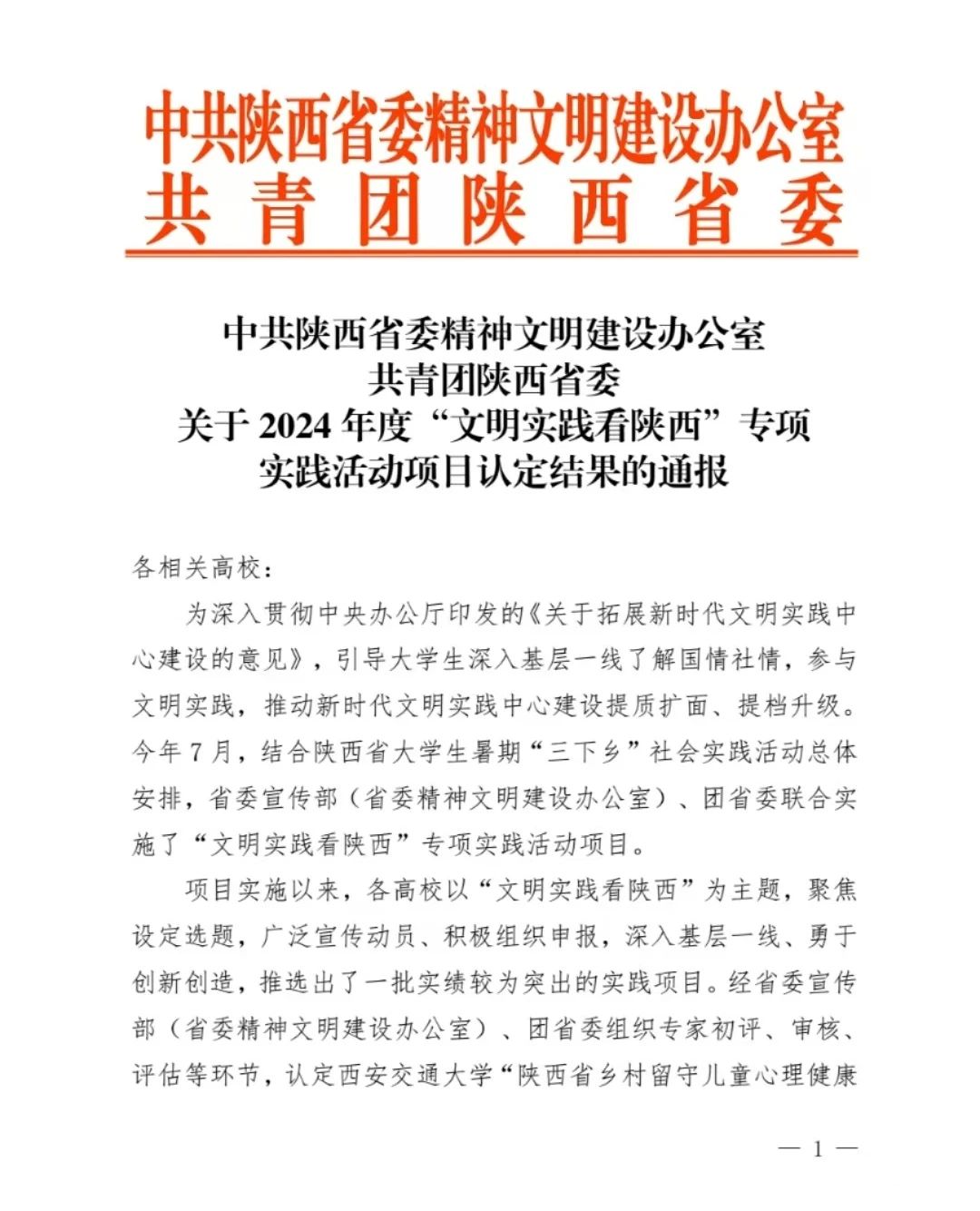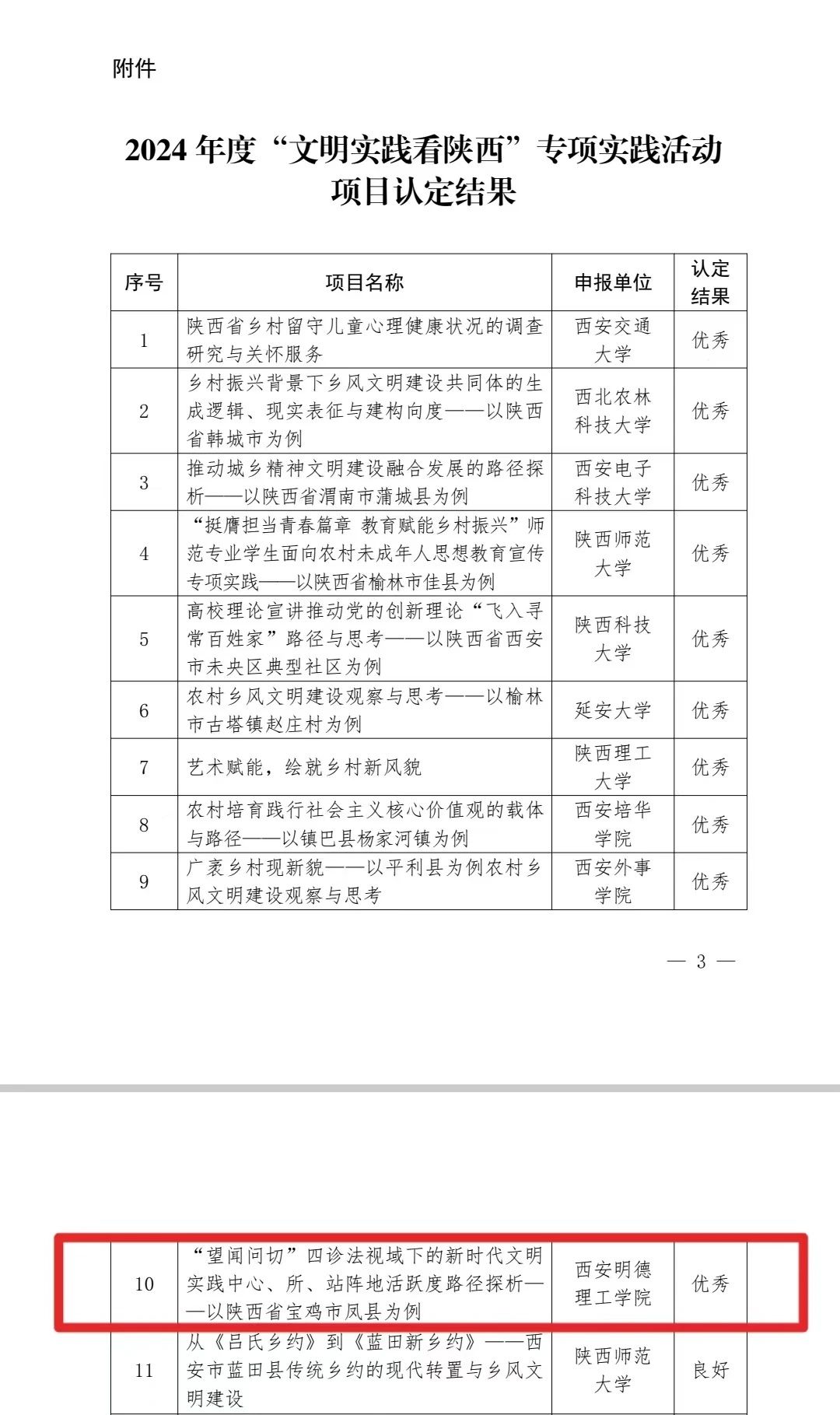 中共陕西省委精神文明建设办公室、共青团陕西省委公布的《关于2024年度“文明实践看陕西”专项实践活动项目认定结果的通报》中,我校《“望闻问切”四诊法视域下的新时代文明实践中心、所、站阵地活跃度路径探析—以陕西省宝鸡市凤县为例社会实践队》项目获得“优秀”认定结果。