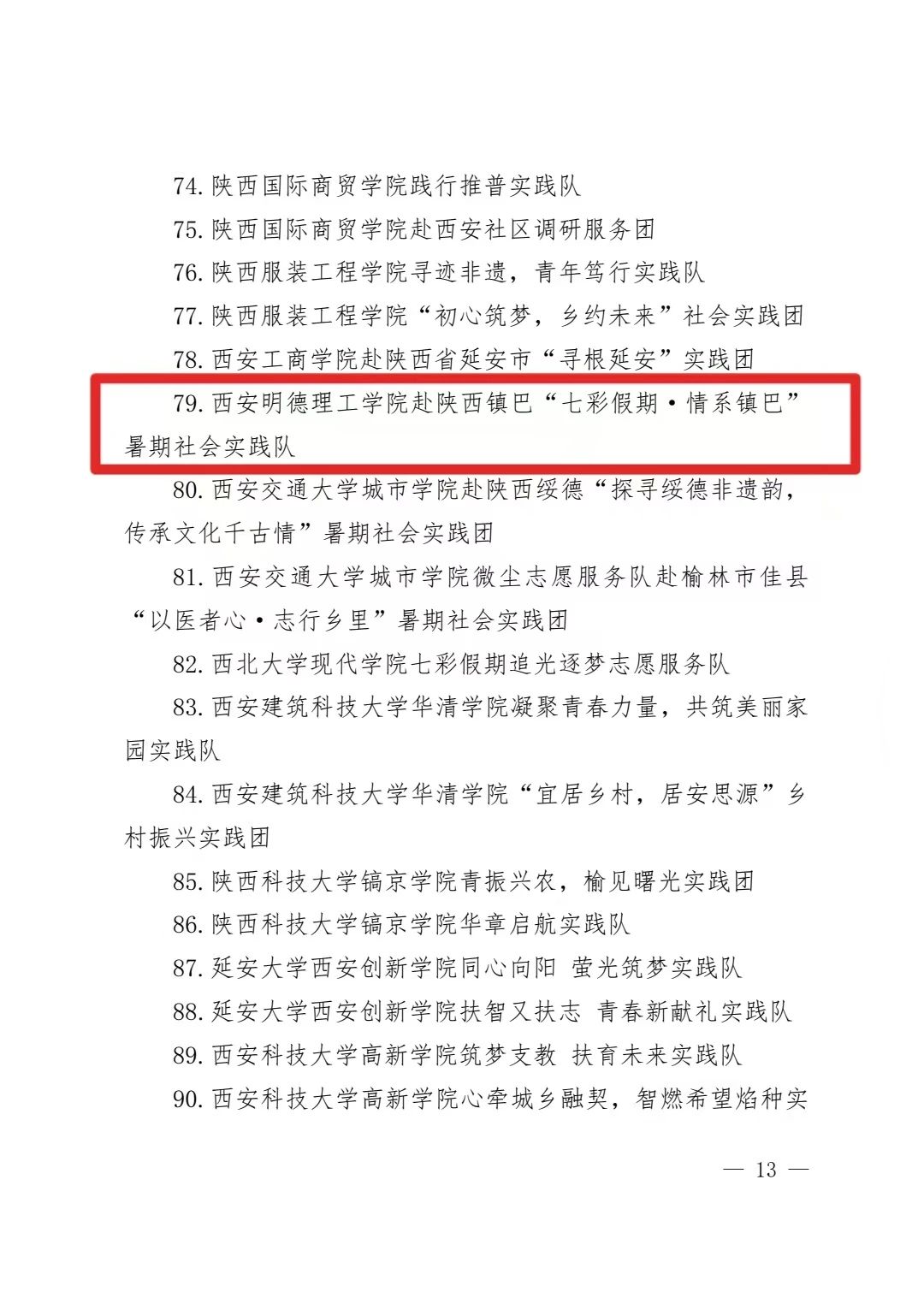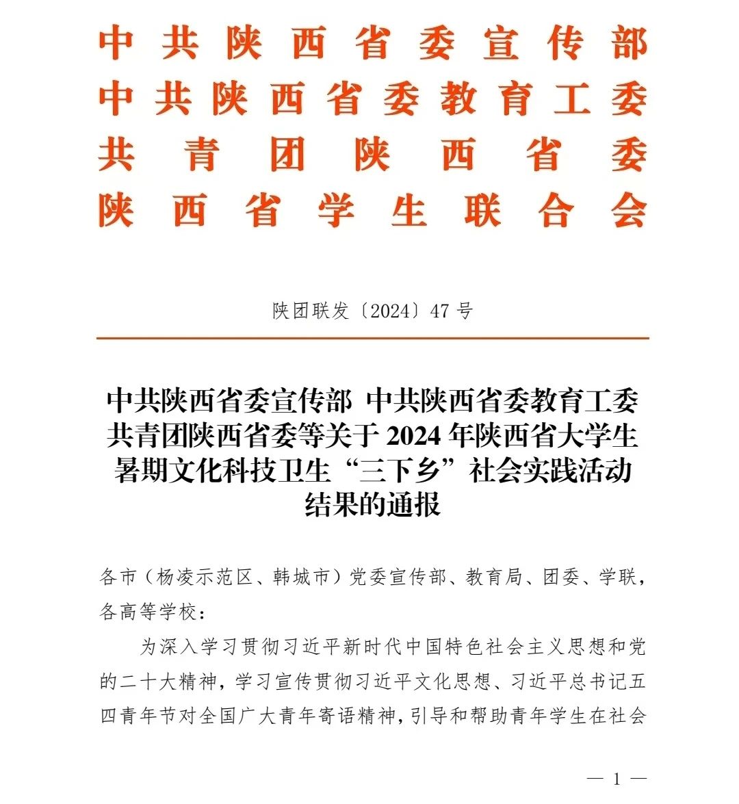 近日,中共陕西省委宣传部、中共陕西省委教育工委、共青团陕西省委下发了《关于2024年陕西省大学生暑期文化科技卫生“三下乡”社会实践活动结果的通报》,学校获得“省级示范学校”。九州(中国)-九州(中国)赴陕西镇巴“七彩假期·情系镇巴”暑期社会实践队荣获省级优秀团队,王飞、邹代柳、曹凯荣获省级先进个人。