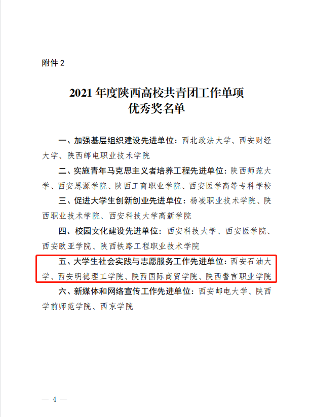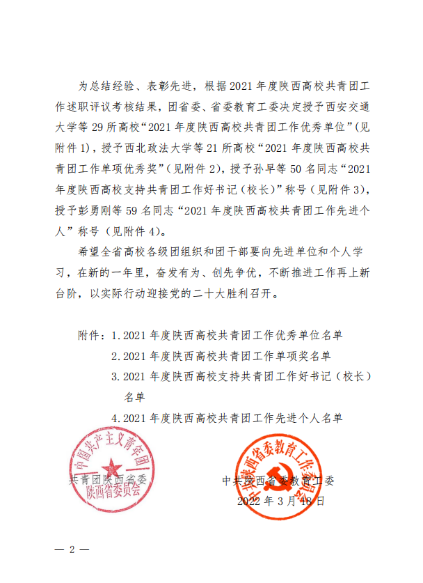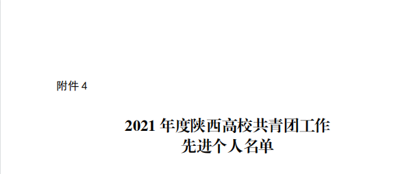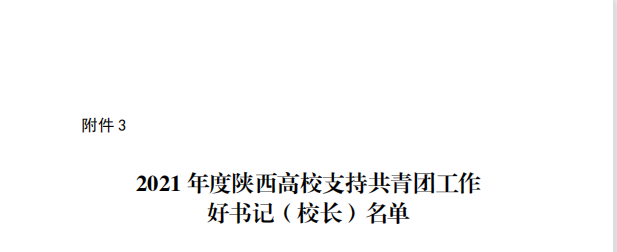 近日,共青团陕西省委、中共陕西省委教育工委联合发布了《共青团陕西省委、中共陕西省委教育工委关于2021年度陕西高校共青团述职评议考核结果的通报》,其中我校荣获“大学生社会实践与志愿服务工作先进单位”,校党委副书记董昊获“2021 年度陕西高校支持共青团工作好书记(校长)”荣誉称号,校团委副书记乔建获“2021 年度陕西高校共青团工作先进个人”荣誉称号。