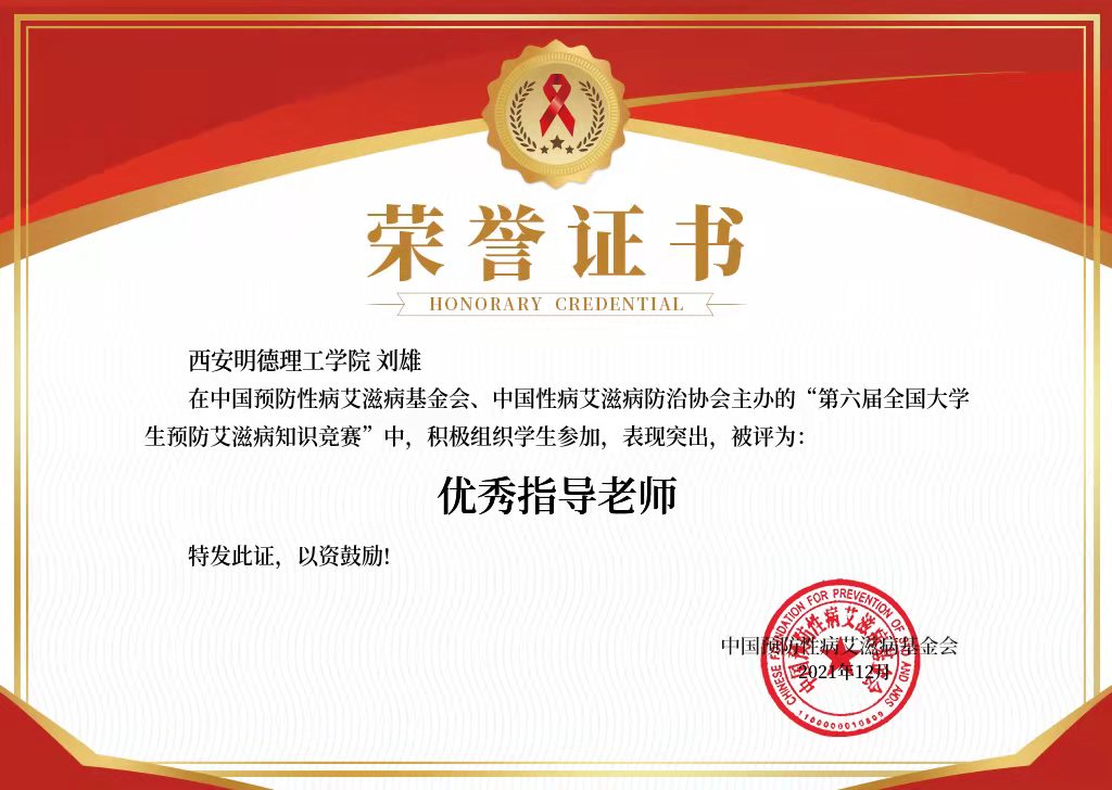 为落实《“健康中国2030”规划纲要》,进一步推进艾滋病防治工作,践行《中国遏制与防治艾滋病“十三五”行动计划》中关于“持续加强重点人群宣传教育”以及“积极发挥学生社团、青年志愿者等的作用。2021年,我校青年志愿者服务团承办了由中国预防性病艾滋病基金会、中国性病艾滋病防治协会主办的“第六届全国大学生预防艾滋病知识竞赛”,学校956位同学积极参赛,取得了良好的成绩,其中我校青年志愿者服务团被评为“优秀承办单位”,校团委刘雄荣获“优秀指导教师”称号,陈瑾瑜等3人荣获“优秀组织者”称号,严建雪等7人荣获“优秀志愿者”称号。