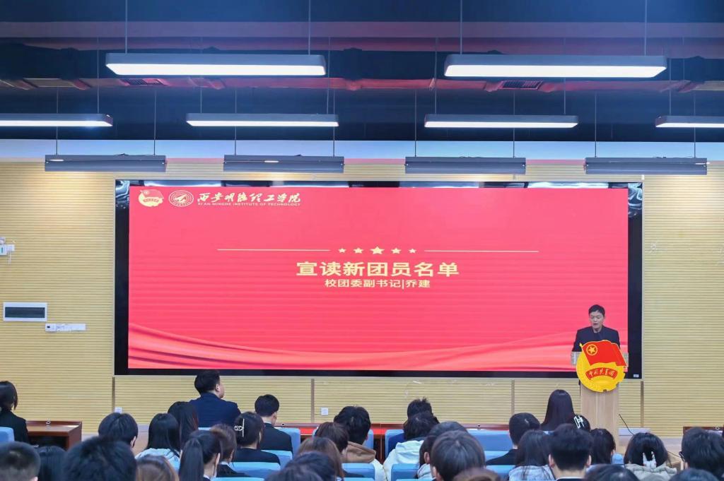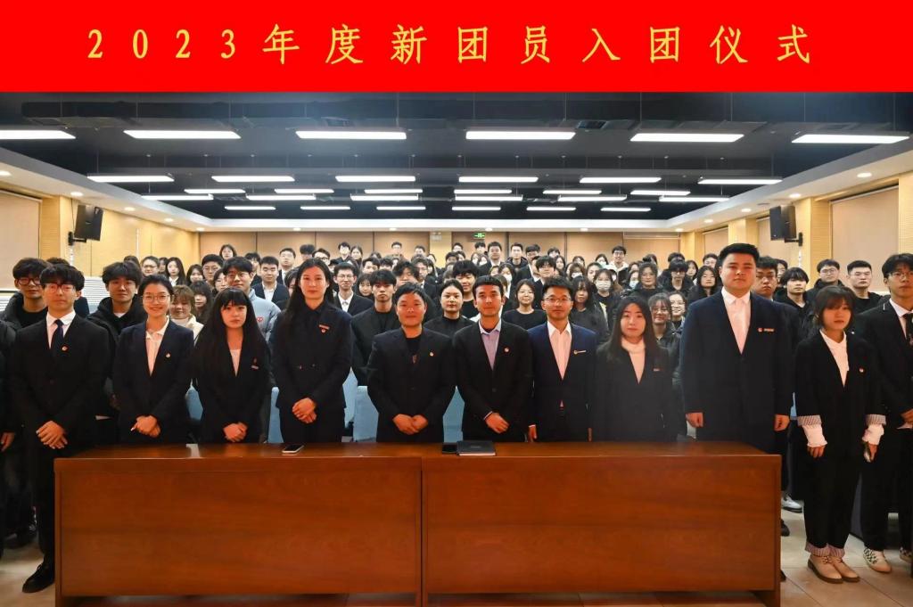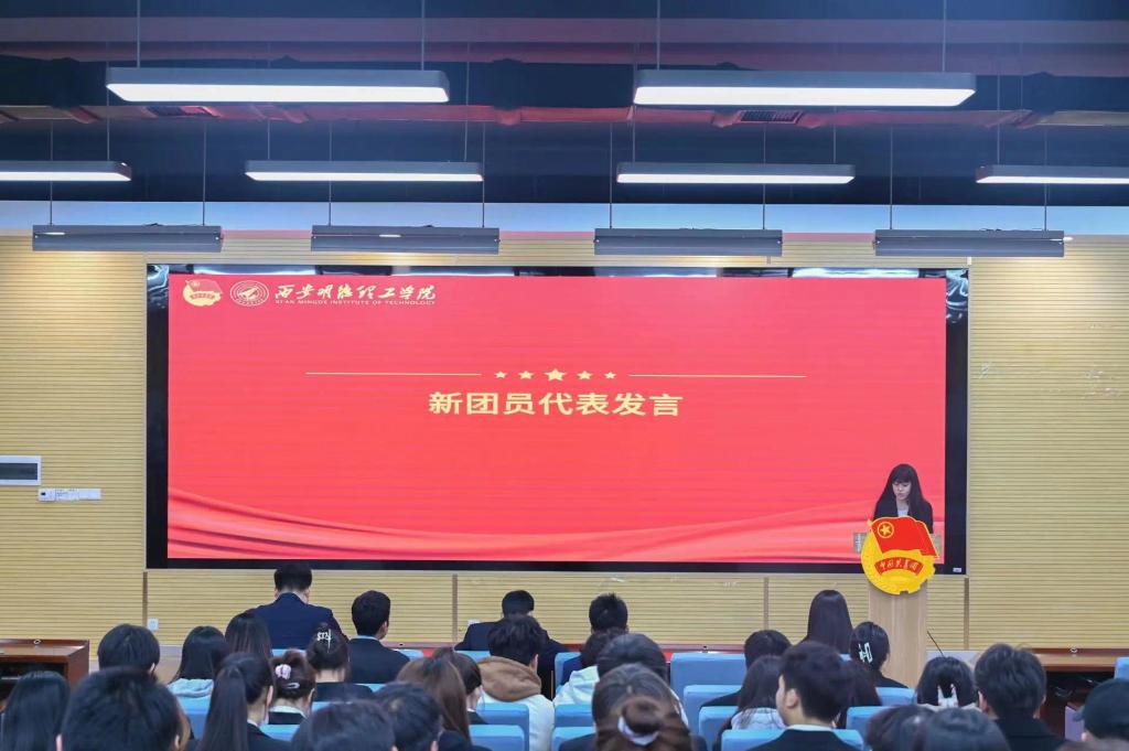 活动伊始,全体参会成员起立共唱《中华人民共和国国歌》;校团委副书记乔建老师宣读了2023年度新发展团员名单;各二级学院团委书记为新团员代表颁发团员证并佩戴团徽;校团委办公室梁智杰同学带领新团员庄严宣誓;入团介绍人代表兰天舒同学宣读了《中国共产主义青年团章程》中有关团员的权利和义务的相关内容;吕梦菲同学代表新团员发言,她对自己能光荣地加入中国共青团而感到无比自豪,她号召大家要永远铭记自己立下的誓言,以团员的标准严格要求自己并承诺在今后的学习生活中要不断提高自己、完善自己,不负韶华,勇于担当,力争成为德才兼备的优秀共青团员;校团委乔建老师进行了总结发言,他激励青年学生要传承革命精神、坚定理想信念、勤奋学习、练就本领。他讲到,广大团员要时刻牢记入团誓词,践行初心诺言,勇于进取创新,甘于艰苦奋斗,用执着的信念、只争朝夕的精神书写炫彩的青春华章。