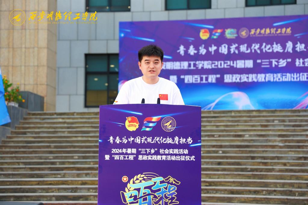 语言文化传播学院辅导员张兴代表社会实践指导教师发言,经济与管理学院学生申京杰代表社会实践志愿者发言,表达了要在实践过程中奉献智慧、贡献力量,展现明德青年的责任与担当。