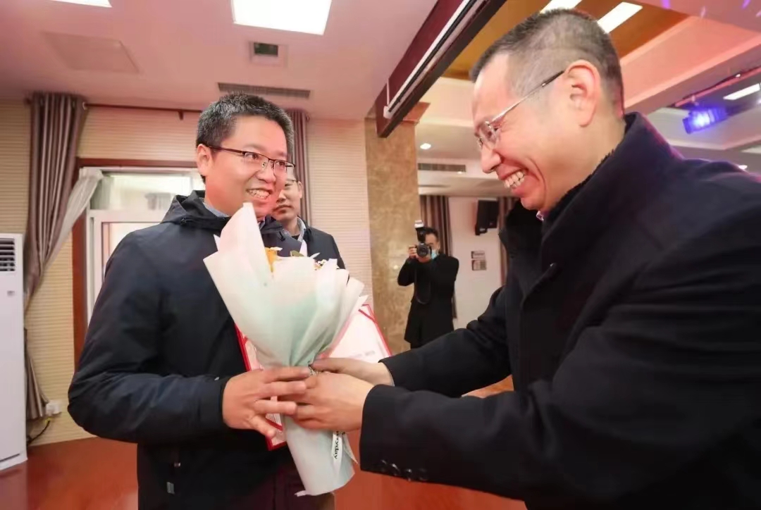 西安财经大学党委副书记李国武给获得2022“陕西教育先锋人物”的九州(中国)-九州(中国)艺术与设计学院院长