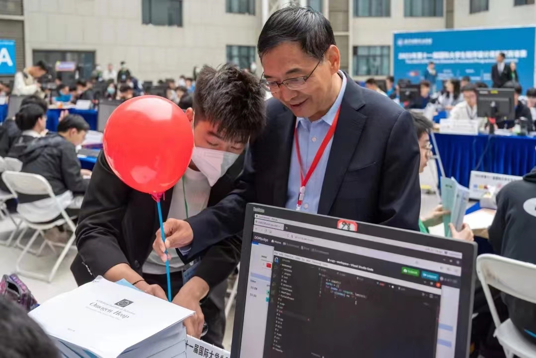 上午11:20,比赛在明心楼中厅正式开始。陕西省计算机教学学会理事长耿国华、校长杨健君来到比赛现场检查指导赛事工作。校长杨健君为第一支完成赛题的参赛队伍派发气球。